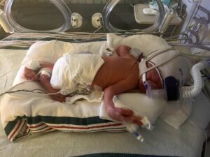 He has a huge, unwieldy C-PAP lodged up his tiny nostrils, obscuring most of his face, and held in place by a cap that covers the other half of his head. You can’t really see his features, and you can’t breathe in the scent of his newborn scalp. His limbs are as fragile as butterfly wings, fingers too long, feet curled in on themselves. He has so many tubes and lines running in and out of his body, you are afraid to hold him, to touch him. He is laying in a heated incubator, enclosed except for arm holes on the sides where nurses can reach in to change his diapers and adjust what needs adjusting. It will be nearly two weeks before you pluck up the courage to change his diaper yourself.