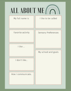 A great way to relay all of the specific information about your child is through an “All About Me” page. These handouts are familiar to teachers, as they are commonly used in the schools at the beginning of the school year. In the worksheet, include interests, likes, dislikes, sensory preferences, modes of communication, and whatever else is relevant to your child. These documents are also helpful for the medical teams working with your child as well. I have created them for doctors, child life specialists, and therapy teams. I have found that these documents help communicate important information when parents are not physically present or are unavailable. They also help at times of transition.