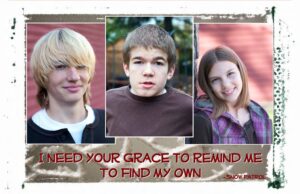 Next came acceptance and determination with a quote by Albert Einstein. As Ben aged and his disabilities grew, his perseverance inspired a card with a card with a quote from Snow Patrol, “I need your grace to remind me to find my own.” Our last taken just months before Ben died was a photo of us all in Santa hats and fake beards, except Noah, whose real “Kris Kringle like” beard inspired the photo shoot. Ben’s enduring humor was captured in his choice of the ‘bah humbug’ hat.