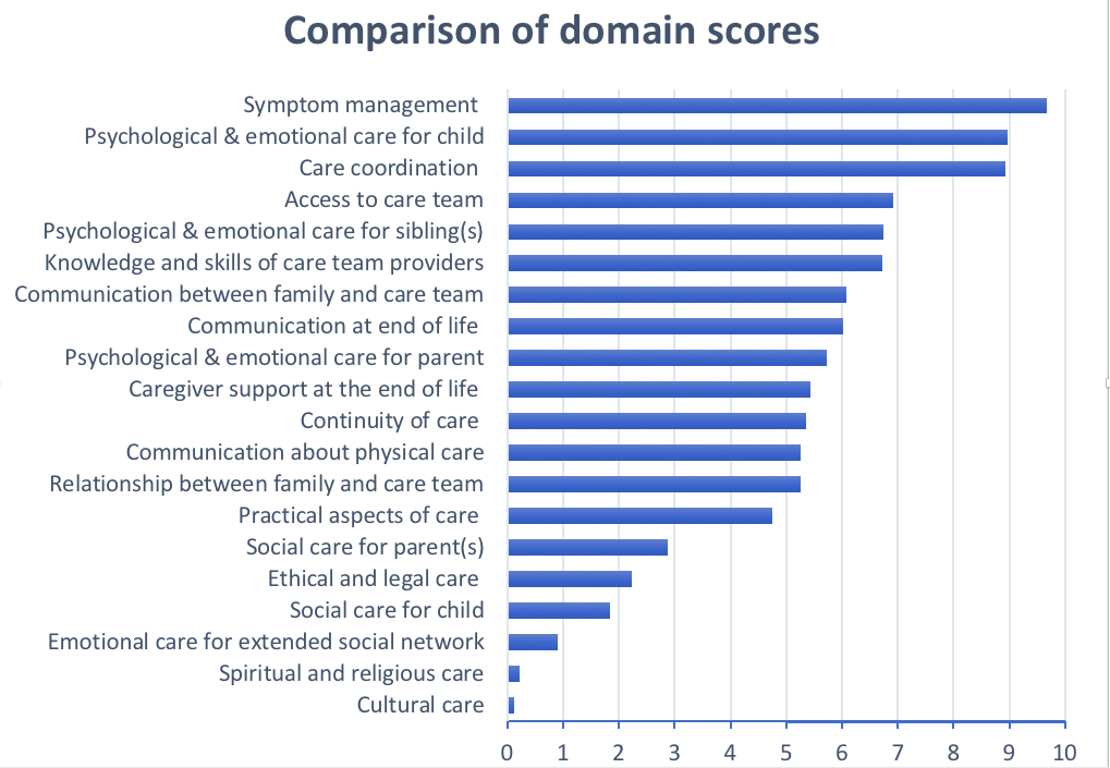 Parents ranked the domains Symptom management the highest, followed by Psychological & emotional aspects of care for the child, and Care coordination. Among the lowest-ranked domains were Emotional care for the family’s extended social network, Spiritual and religious care, and Cultural care.